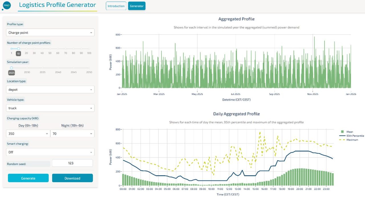 Als onderdeel van de nieuwe Outlook Logistiek is er ook een laadprofielengenerator voor logistieke voertuigen (trucks en bestelauto’s) gemaakt. Deze tool geeft inzicht in de elektriciteits- en vermogensvraag van elektrische logistieke voertuigen op diverse laadlocaties. Via deze tool kunnen laadprofielen voor deze voertuig- en locatietypes gegenereerd en gedownload worden.