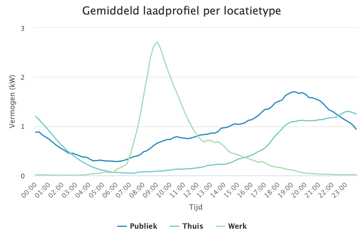 De locatie van de laadpaal is erg belangrijk voor het bepalen van een vermogensprofiel omdat verschillende groepen elektrische rijders laden op verschillende momenten van de dag. Zie ook onderstaande grafiek. Het is dus belangrijk dat de gegenereerde profielen locatie-afhankelijk zijn. De generator kan daarom profielen genereren voor laadpalen en elektrische auto’s op thuis-, werk- en openbare locaties. Dit wordt gedaan door in het model alleen laadsessies te gebruiken die afkomen van het gekozen locatietype. Dit zorgt er automatisch voor dat het laadprofiel past bij de doellocatie.