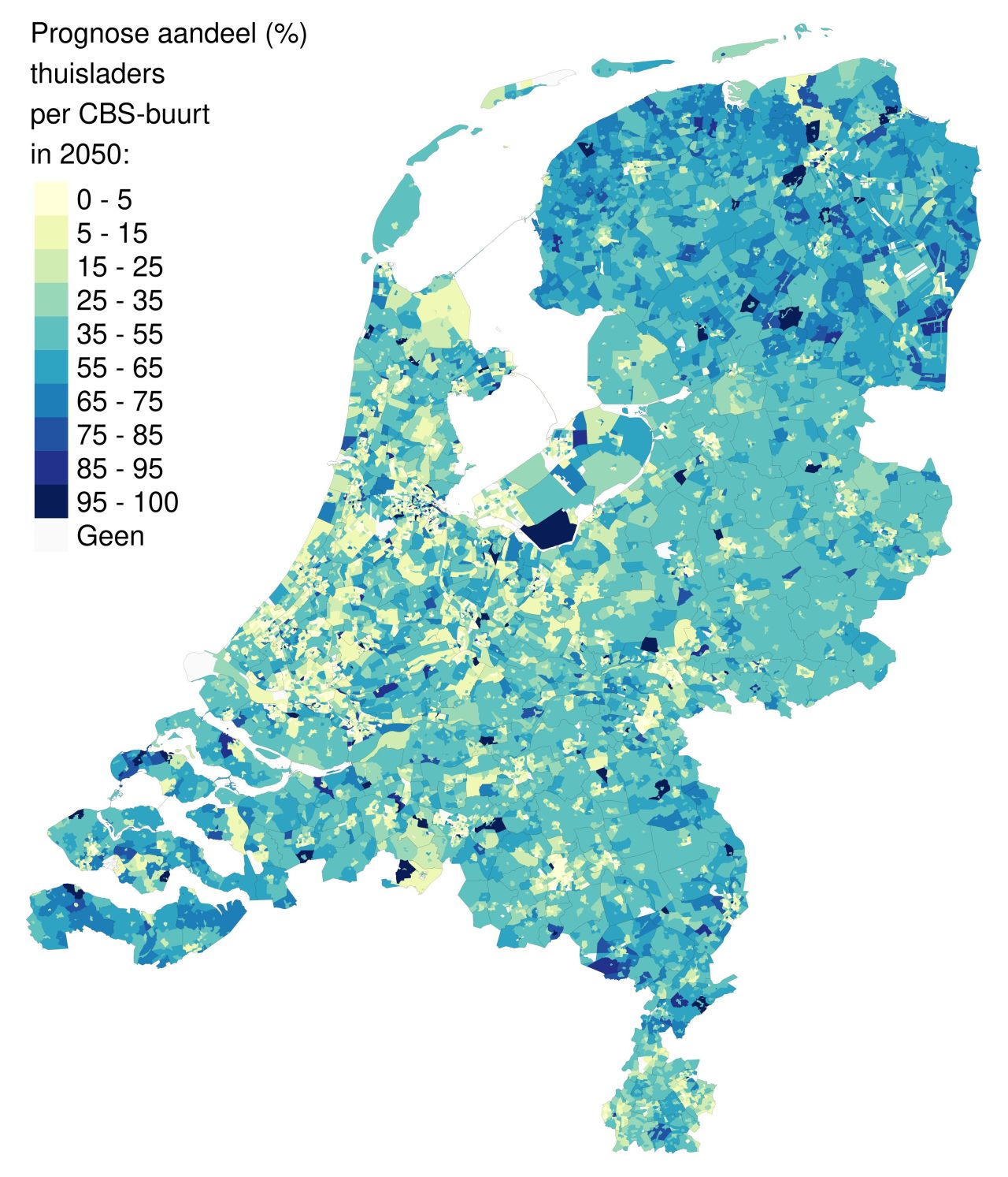 De onderstaande kaart laat de verwachte spreiding van het aandeel thuisladen in 2050 zien. Over het algemeen is de concentratie van thuisladen hoger in minder stedelijke gebieden, waar relatief meer huishoudens beschikken over een eigen parkeerplek.