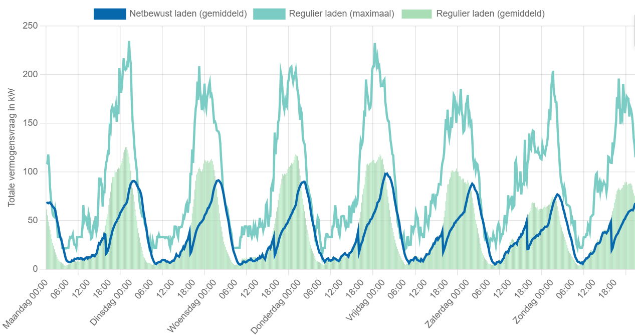 Netbewust thuisladen, een vorm van slim laden, zorgt ervoor dat de laadsessies via een marktpartij worden aangepast op de krapte op het stroomnet. De pieken die bijvoorbeeld tussen 17:00 – 23:00 uur ontstaan bij het regulier thuisladen van elektrische auto’s worden dan significant gereduceerd. Netbewust thuisladen met alleen een basiscapaciteit van 4 kW per laadpunt levert in onze simulaties een afname van meer dan 40% in de piekbelasting op tussen 17:00 – 23:00 uur in vergelijking met regulier laden. De uitgangspunt van 4 kW per laadpunt als een basiscapaciteit is gebaseerd het op nationaal actieprogramma Slim Laden voor Iedereen.