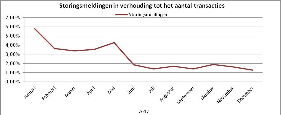 Figuur 1: Storingsmeldingen per maand als percentage van het aantal transacties. In het begin van 2012 resulteerde bijna 6% van alle laadtransacties in een storingsmelding, eind 2012 is dit gereduceerd tot ongeveer 1,3%.