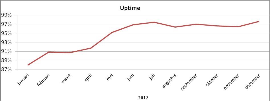 Uptime stijgtOok de ”uptime” van laadpunten is in 2012 gegroeid, van 88 procent naar 98 procent. ”Uptime” is de tijd dat de laadpunten verbonden zijn met het backoffice-systeem. ”Downtime” is de tijd dat de verbinding tussen een laadpunt en het backoffice is verbroken. Dit kan onder andere worden veroorzaakt door het wegvallen van de telecommunicatie of de netspanning vanwege een stroomstoring. Indien de laadpaal zijn communicatie met het backoffice verliest, is deze in de meeste gevallen nog steeds beschikbaar voor het opladen van elektrische auto”s (tenzij de stroom is uitgevallen). Downtime wil daarom niet direct zeggen dat er niet bij het laadpunt opgeladen kan worden. Toch is het van belang dat de uptime zo hoog mogelijk is. Indien een e-rijder hinder ondervindt bij het laden van zijn auto, is het mogelijk om op afstand (telefonisch) een diagnose te stellen en de laadpaal weer functioneel te maken.