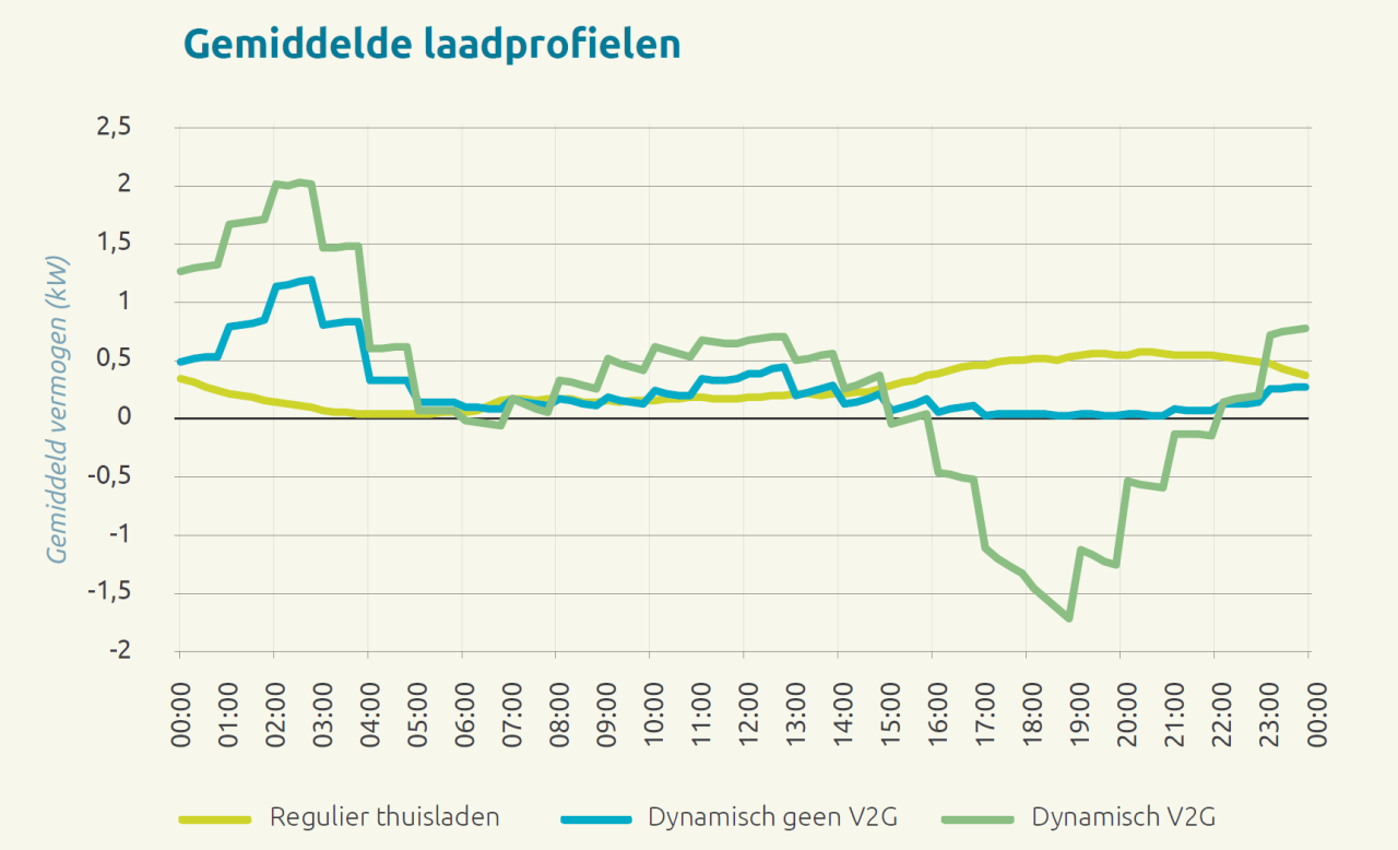 Om de potentie van bidirectioneel laden of V2G (vehicle to grid) te kunnen kwantificeren, keken de onderzoekers naar personenauto’s en bestelauto’s die op eigen terrein van huishoudens worden geladen en ontladen. Deze variant komt volgens het onderzoek het snelst van de grond. Naar verwachting wordt 19% van de laadvraag voor personenauto’s met een eigen thuislader geladen en is dat 9% voor bestelauto’s. Als je er dan vanuit gaat dat de mensen die thuis V2G gaan gebruiken de kosten zoveel mogelijk willen drukken, ontstaan er laadprofielen voor V2G. Ze laden in dat profiel wanneer de stroom het goedkoopste is, leveren terug als de prijs hoog is en gebruiken zoveel mogelijk eigen stroom van zonnepanelen. Zo ontstaan interessante verschillen ten opzichte van niet-V2G-profielen: tijdens de avondpiek op het elektriciteitsnet wordt gemiddeld gezien dan energie terug geleverd, de laadpiek verschuift naar de rustige nachtelijke uren wat over het algemeen gunstig is voor het lokale stroomnet. Gemiddeld gaat het om 1 tot 2 kilowatt per huishouden aan teruglevering in de piekuren (zie figuur 1). Individueel kan het wel 11 kilowatt vermogen zijn.