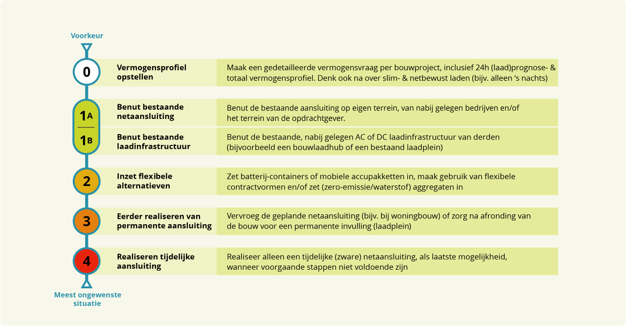 Om bouwbedrijven en opdrachtgevers bij de transitie te ondersteunen ontwikkelde ElaadNL in overleg met de netbeheerders de ‘Ladder van laden voor elektrisch bouwen’. Vanuit het beheer van het stroomnet en het maatschappelijke belang, is de meest gewenste situatie dat geladen kan worden op bestaande laadinfrastructuur en op bestaande stroomaansluitingen rondom de bouwlocatie. Ook flexibele oplossingen zoals verwisselbare accupakketten of grote batterij-containers die elders geladen worden, passen prima. Daarna komt het naar voren halen van een toch al noodzakelijke netaansluiting zoals dat kan bij een nieuwbouwwijk. Omdat de capaciteit van netbeheerders voor het aanleggen van nieuwe aansluitingen beperkt is, is deze optie al wel minder wenselijk. Minst wenselijk is het aanvragen van een tijdelijke netaansluiting die alleen voor de bouwfase nuttig is. Soms kan het niet anders, maar als er andere oplossingen zijn verdienen deze de voorkeur. In alle gevallen is het tijdig in kaart brengen van de verwachte vermogensvraag cruciaal. Ook in de bouw is het zogenaamde netbewust laden belangrijk. Hierbij wordt vooral geladen tijdens daluren in het stroomgebruik, bijvoorbeeld in de nacht. In veel gevallen kan dat in de bouw prima omdat de werktuigen dan toch stil staan.
