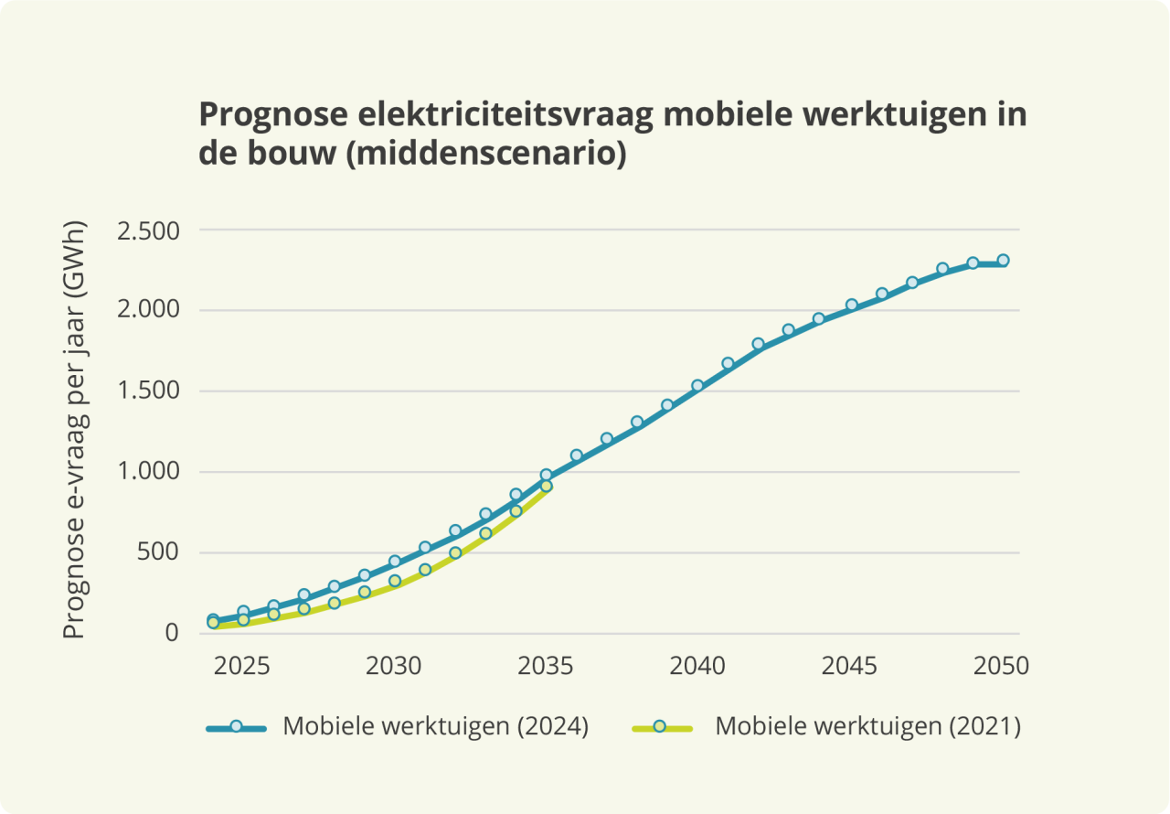 De onderzoekers verwachten een grotere groei van de elektrificatie van de bouw. De groei is door de onderzoekers uitgewerkt in drie scenario’s: hoog, midden en laag. Op basis van verschillende uitgangspunten verschilt het jaar waarin de instroom 100% elektrisch is en het jaar wanneer het volledige materieel geëlektrificeerd is. De totale elektriciteitsvraag in de bouwsector komt volgens de onderzoekers van ElaadNL in het middenscenario uit op 1 TWh (terawattuur) in 2035 en 2,3 TWh in 2050. In vergelijking met de elektrificatie van andere sectoren komt deze markt wat later op gang en duurt het nog even voordat deze geheel volwassen is. Wel verwachten de onderzoekers op termijn een sterke stijging.